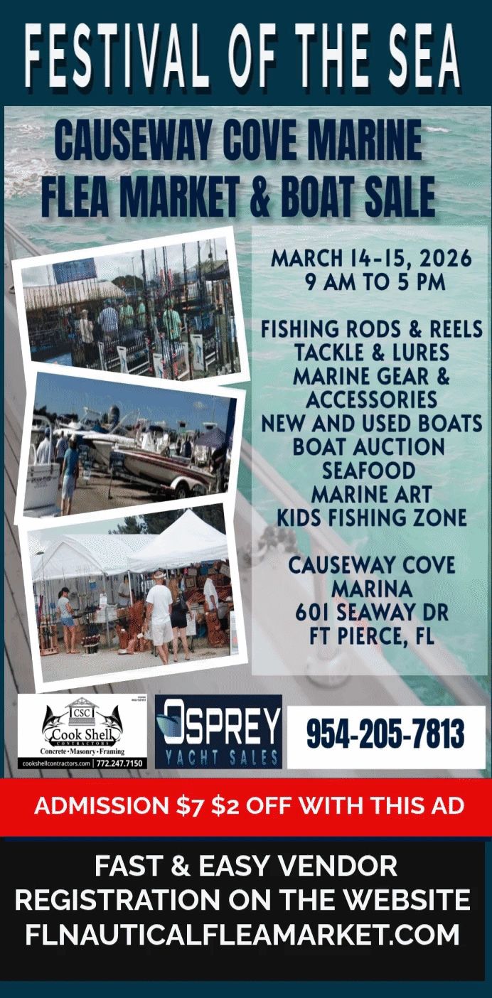 Gear up for Florida's ultimate marine event! The 4th Annual Causeway Cove Marine Flea Market and Boat Sale is set to take over the stunning Hutchinson Island on March 14-15. 2026, from 9 AM to 5 PM at the Causeway Cove Marina. Whether you're a seasoned sailor or a boating novice, this is your chance to explore everything the marine world has to offer, all in one place. β Get All the Details at: FLNauticalFleaMarket.com