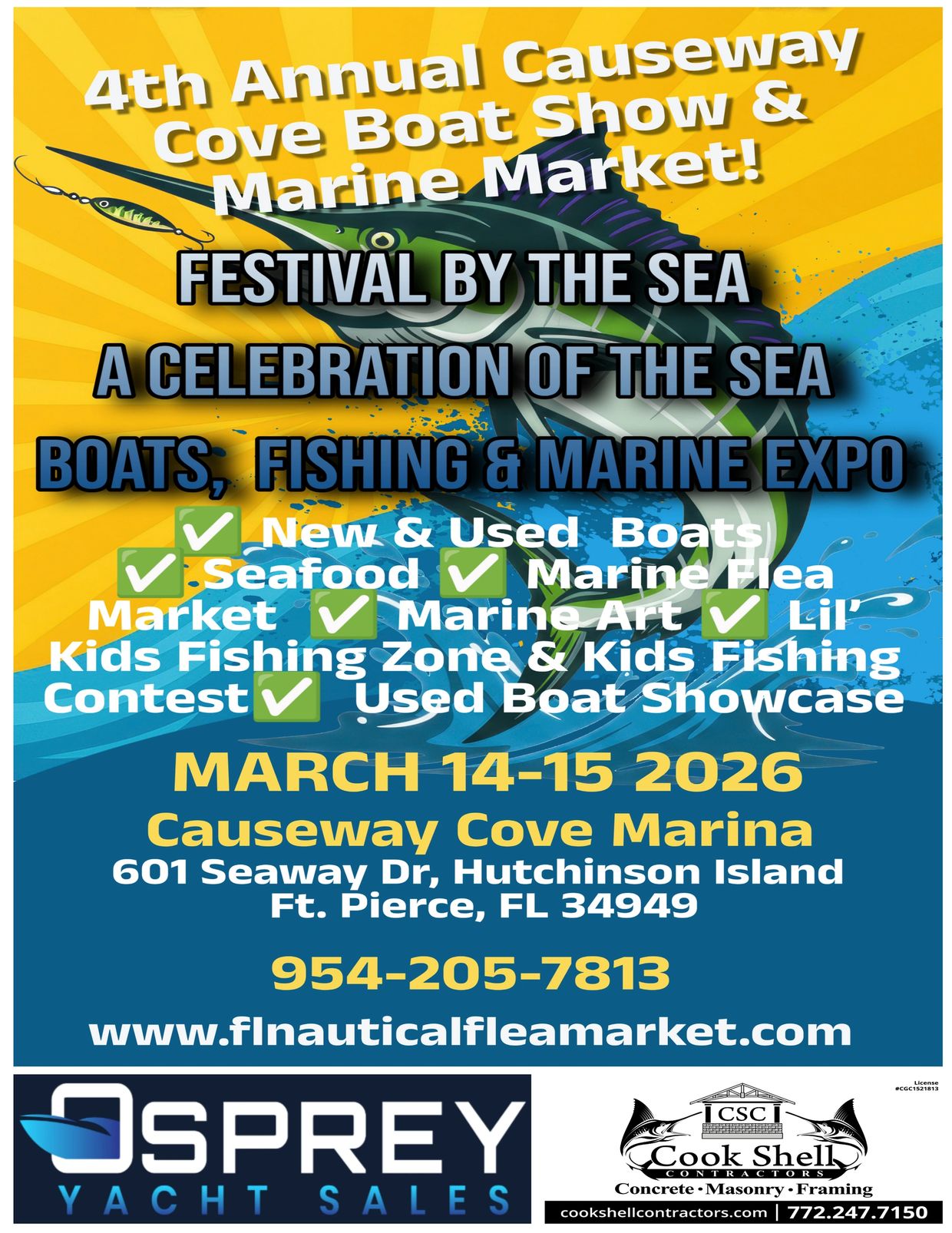 Join us at the Festival of the Sea, March 14-15, 2026, at Causeway Cove Marina in Ft. Pierce, FL! Enjoy new boats, marine flea market, seafood, live music, kids' activities, and more. Fun for the whole family!